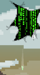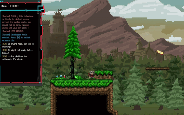 In Decay, the character and the player are split, with the character communicating through the console as they gain awareness, and the player controlling the game, editing the levels, and guiding the character to the next level. The further and further they go, the more the levels, sprites, and background seem to get corrupted. Texture go missing, objects appear randomly, sprites glitch out... almost as if the game files themselves were decaying with each level.