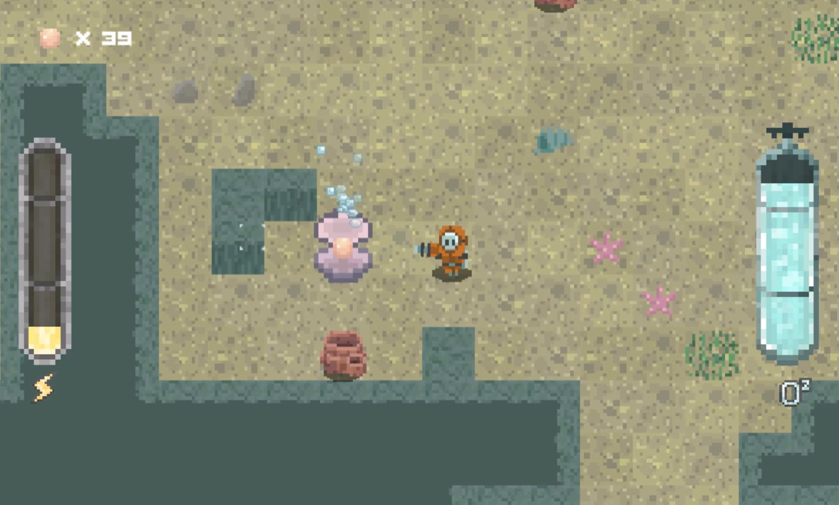 Collectables: either pearls or oxygen bubbles. Pearls will be kept on death, and bubbles replenish a little oxygen;