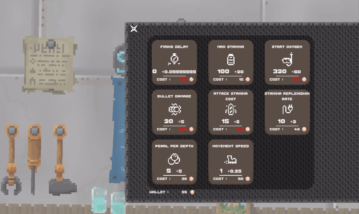 To fit the rules of a roguelite, as well as to give purpose to the player's repeated expeditions, the game is equipped with a persistant upgrades shop. Through it, the player may put to use the pearl they collect down in the depths to upgrade their stats.